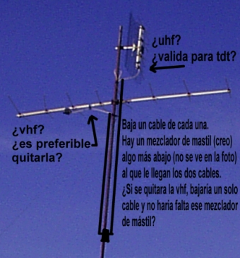 Respecto a la antena de VHF, la que tienes debajo, es una antena para Banda III (canales 5 a 12), lo que tienes que hacer es comprobar si TVE1 todavía la recibes en VHF o ya en TDT. Si la recibes en VHF si la quitas no la verás. Si ya la recibes por UHF, puedes darle otro uso, por ejemplo el de Radio Digital o DAB, aunque hay que recordar que la radio digital emite en polaridad vertical, por lo que tendrás que poner en plano vertical la antena y no horizontal como la tienes ahora. Una cosa el mezclador del que hablas y que continuaré explicando abajo, sólo admitirá Banda III por lo que para la DAB tendrás que pasar de conectarla y tirar cable directamente (si llega buena señal, cosa rara ahora mismo) al receptor DAB.