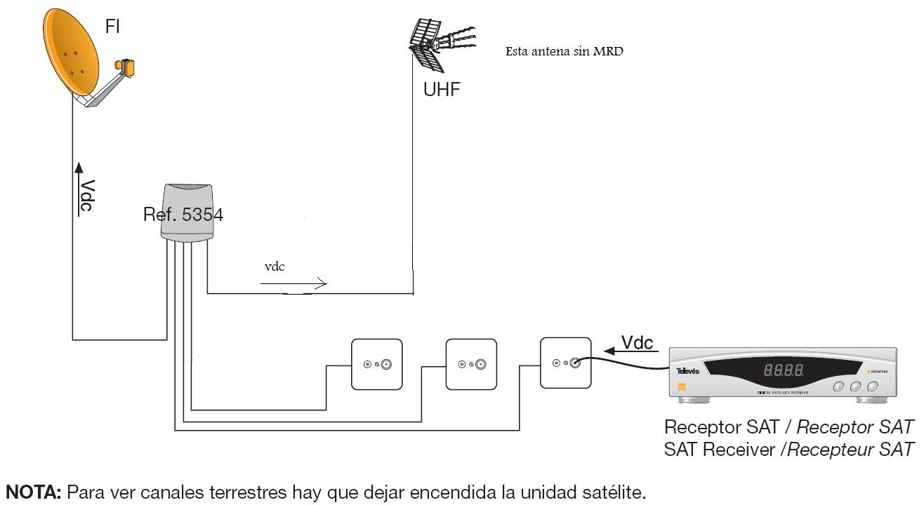 Tengo una instalación ya hecha para satelite. Ahora quiero añadir una untena TDT (que ya tengo) sin MRD (mirad esquema) y tengo que mezclar UHF/SAT en un cable.