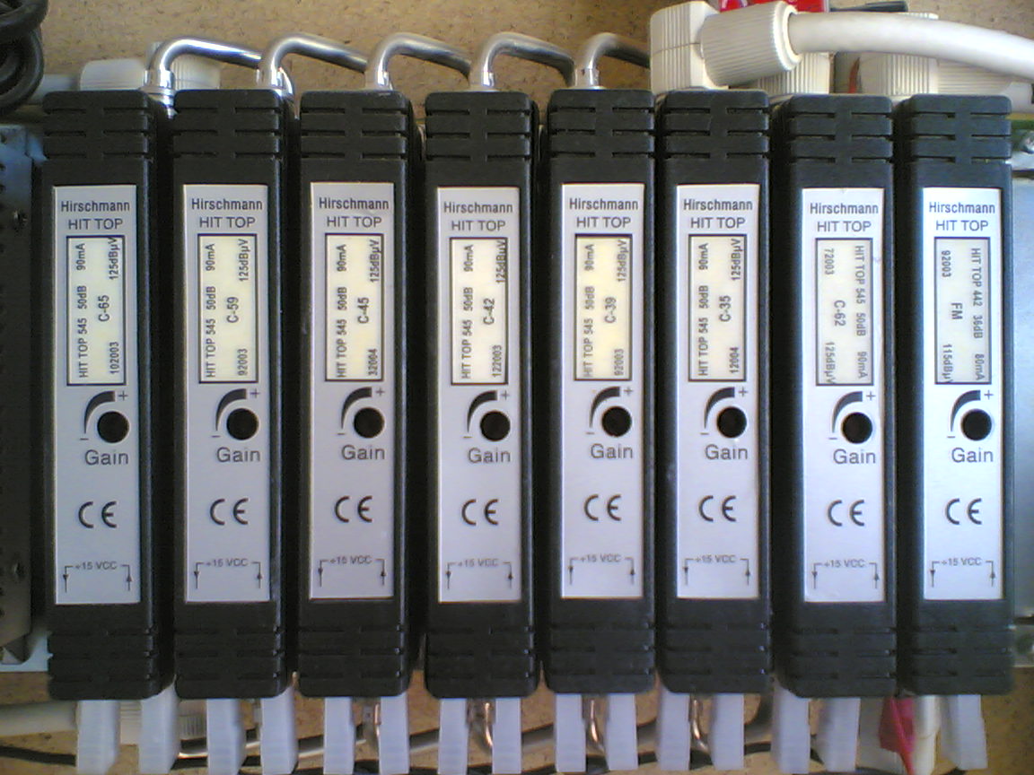 Vivo en un piso de 21 vecinos como es lógico teníamos antes la antena colectiva con una serie de módulos para cada canal de la marca HIRSCHMANN Y PARA LOS CANALES 35, 39, 42, 45, 59, 62,65, y otro para FM.